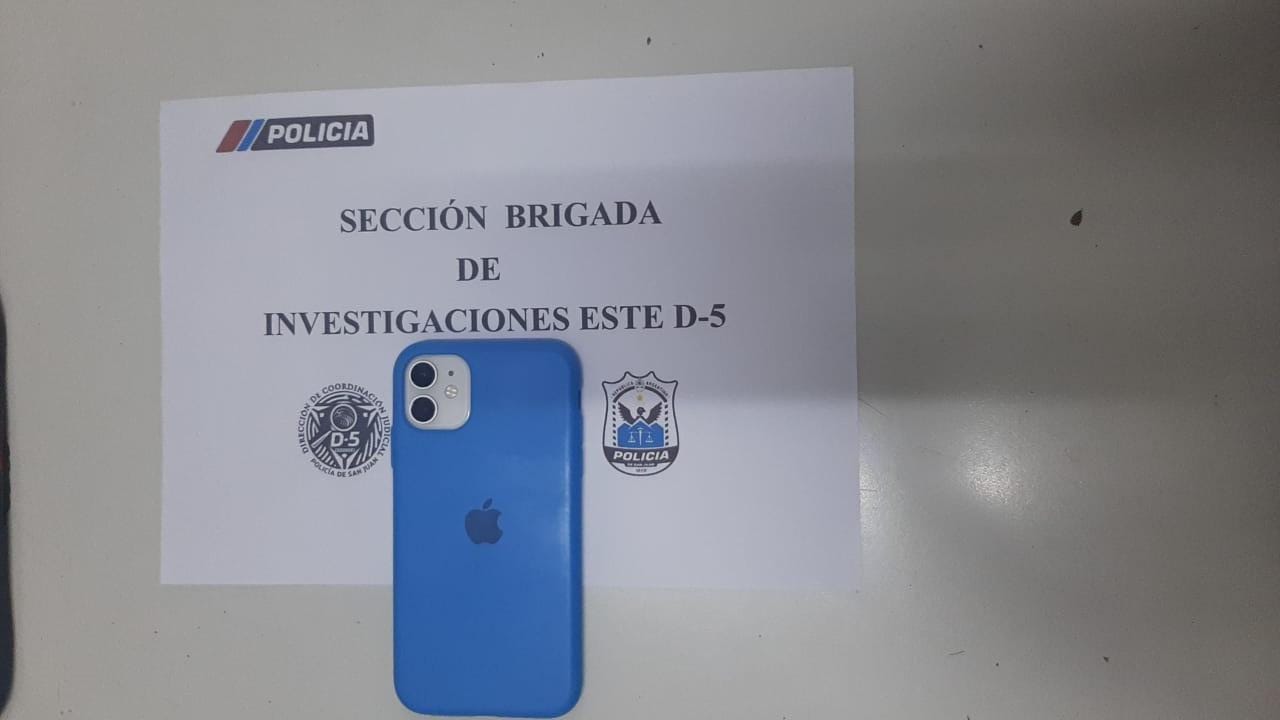 La Secci贸n Brigada de Investigaciones Este D-5 inform贸 que, tras realizar tareas investigativas, se logr贸 recuperar un tel茅fono m贸vil de alta gama marca iPhone modelo 11 ProMax que hab铆a sido denunciado como robado en el departamento de Caucete.
