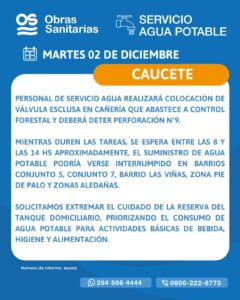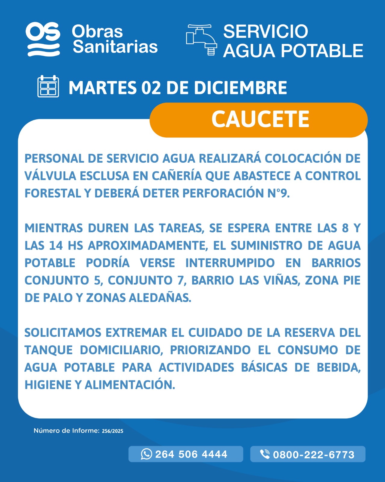 🚱 Servicio de agua potable *posiblemente disminuido* en Barrios Conjunto 5, Conjunto 7, las Viñas, Pie de Palo y zonas aledañas.